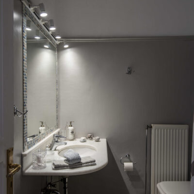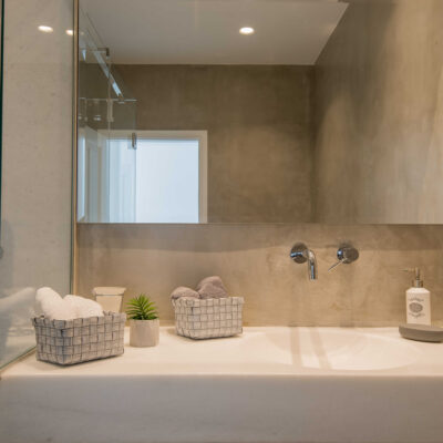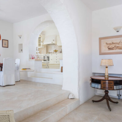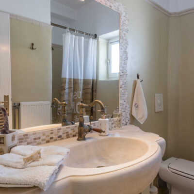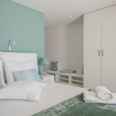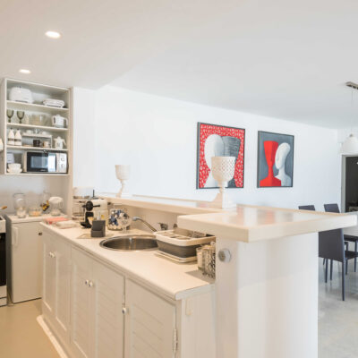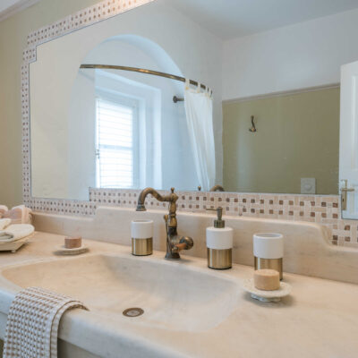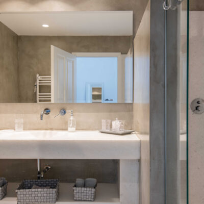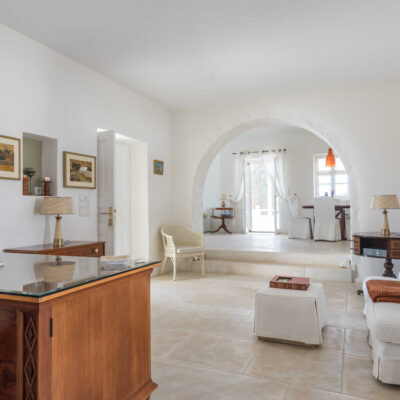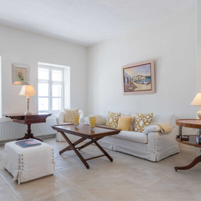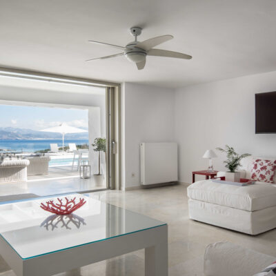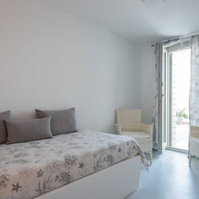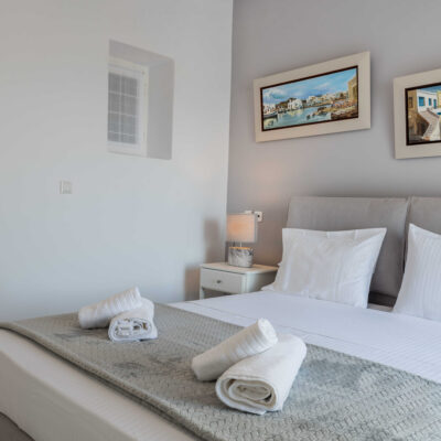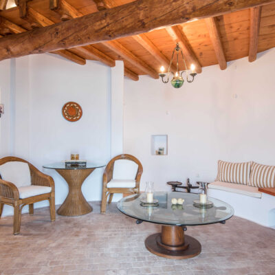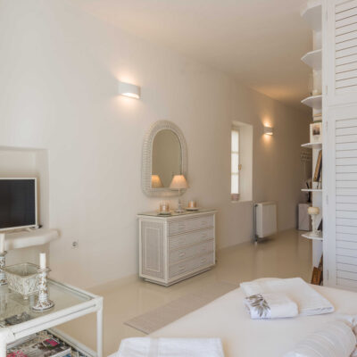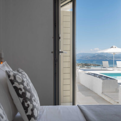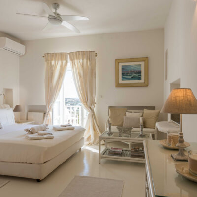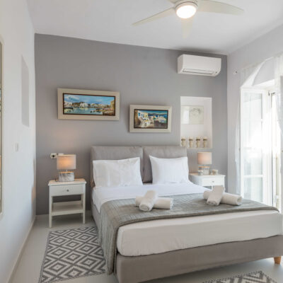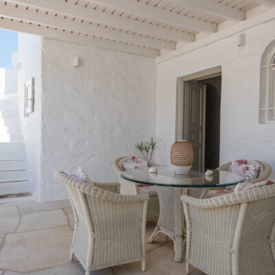 The villa is designed to accommodate up to 10 guests at 5 bedrooms in absolute comfort, featuring a spacious layout with four double master bedrooms in the main house, alongside a detached traditional windmill that offers a one-of-a-kind experience for couples, complete with all the modern comforts and a 180-degree sea view.